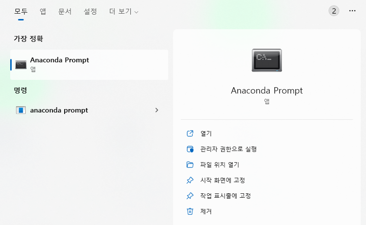 아나콘다가 설치되었으면 window 검색창에 anaconda prompt라고 검색하게 되면 아래와 같은 앱이 뜨게 된다.